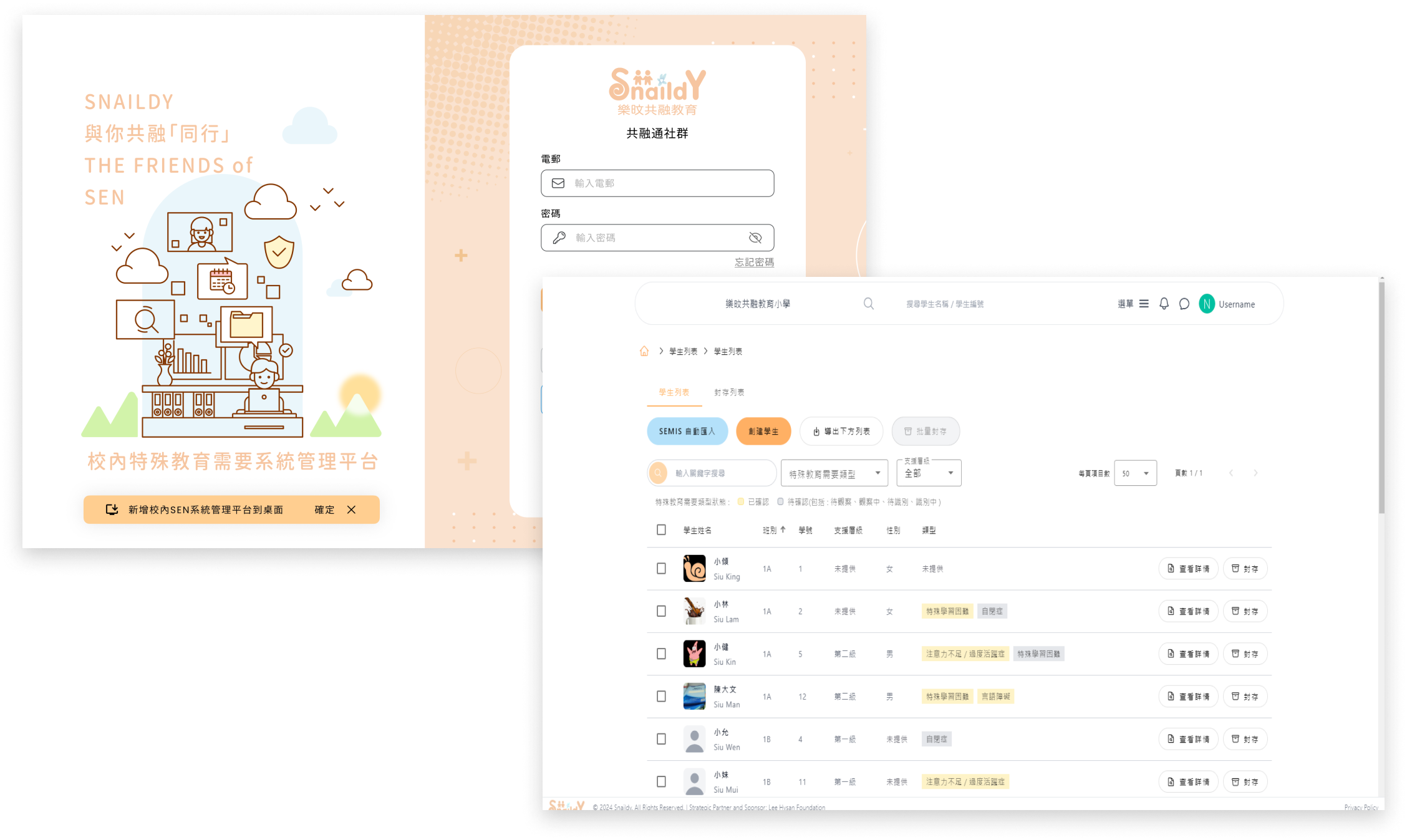 - 1全面管理 SEN 學生資料 (包括學生藥物及病歷紀錄、校內外活動記錄等)2家校 SEN 文件即時互通 (學生支援摘要、年終檢討表、IEP 記錄等文件)3全校師生共同支援參與 (每位老師皆可使用平台更新及查詢 SEN 學生資訊)